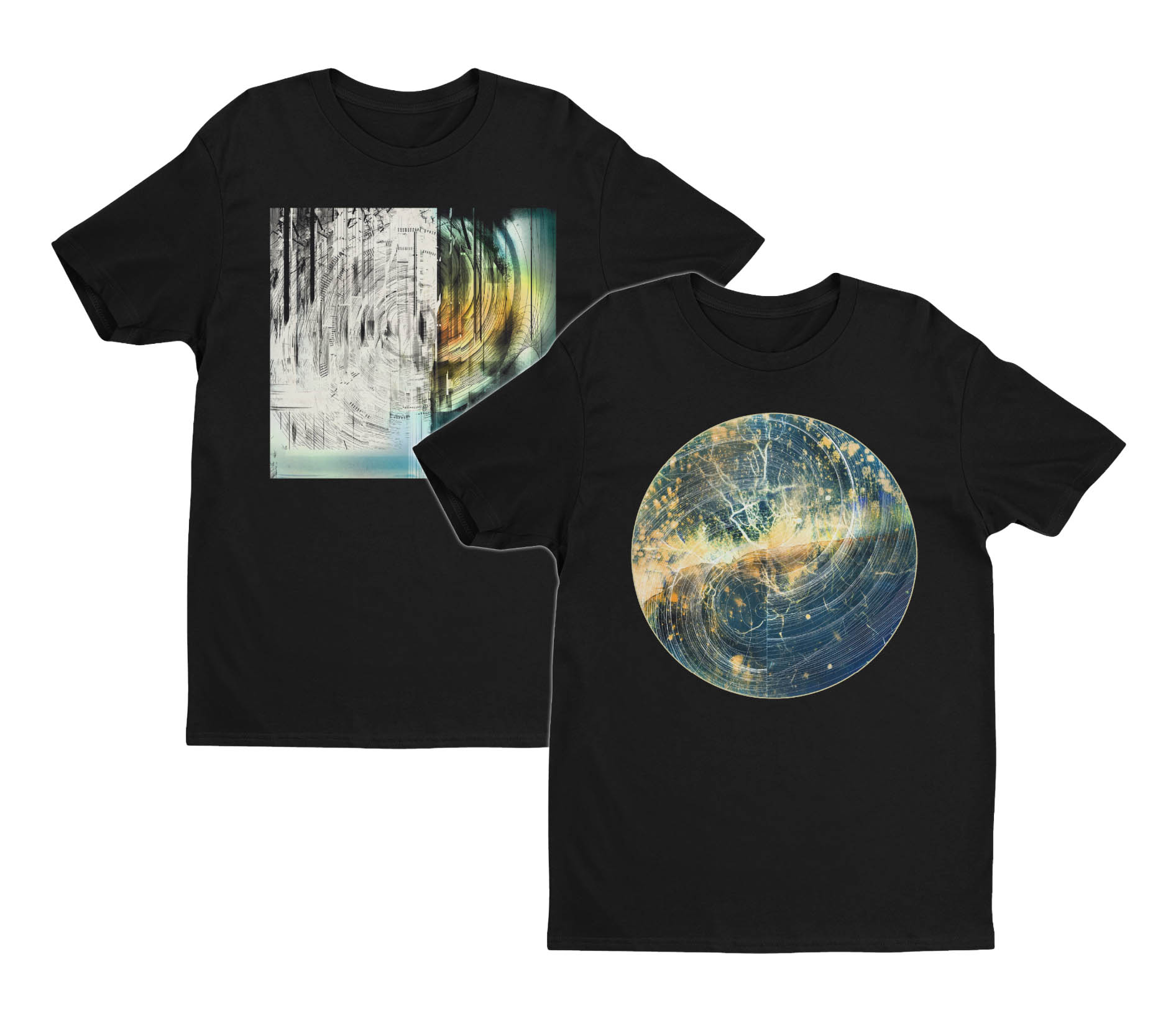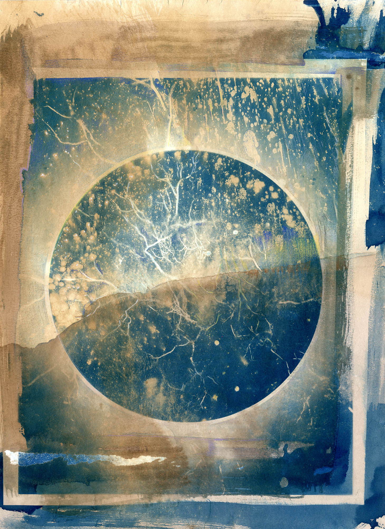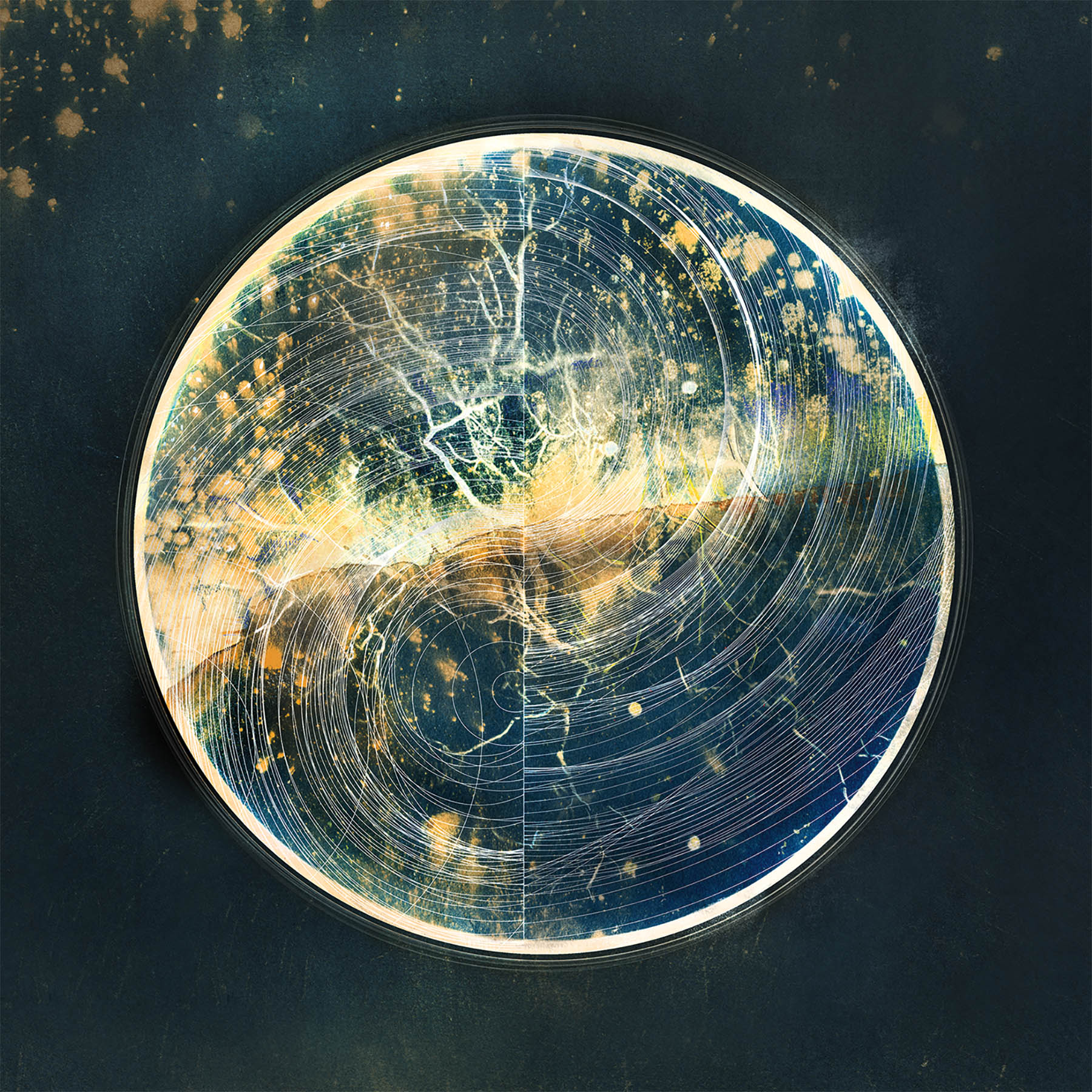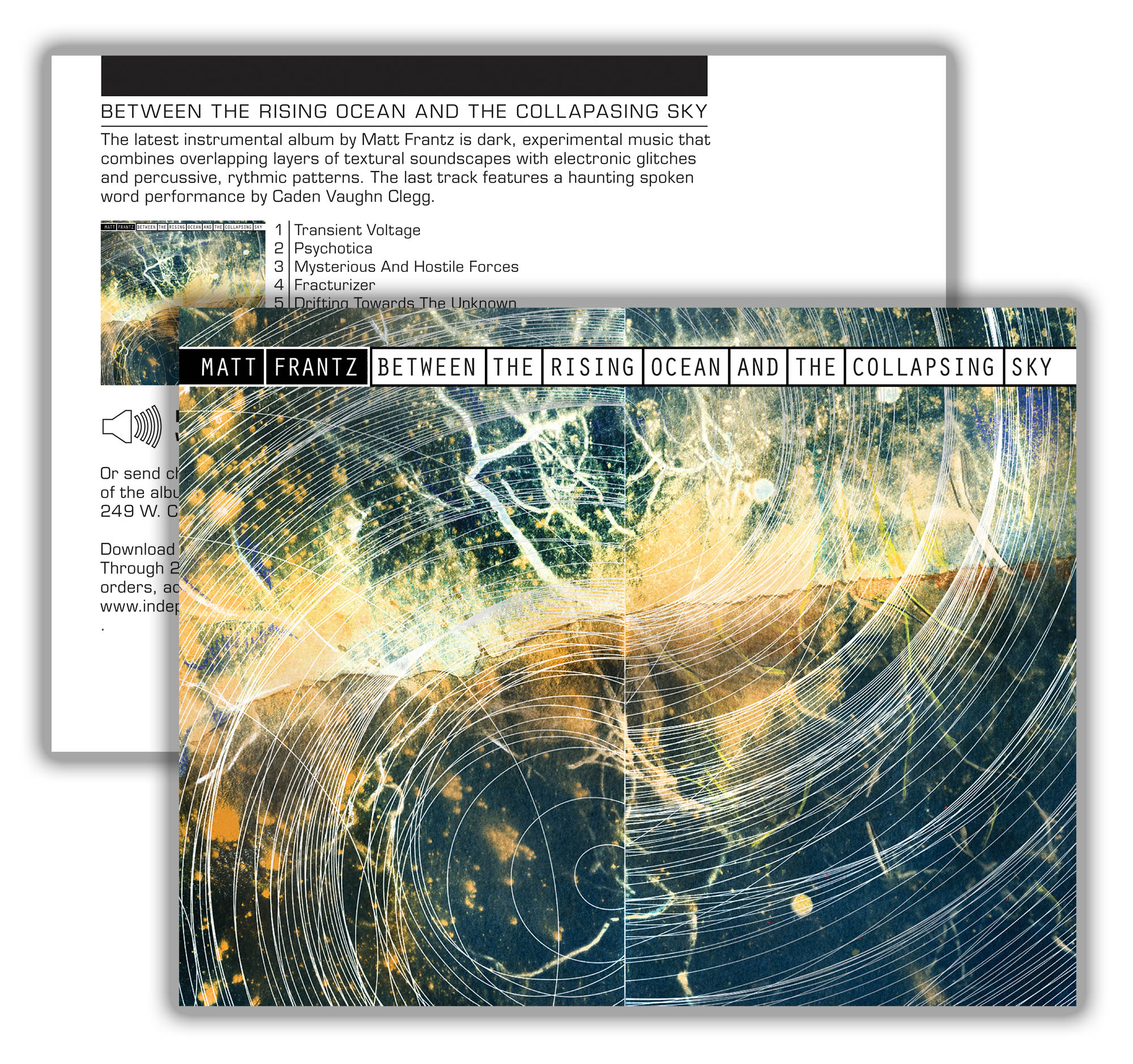 The images above show the evolution of the cover and disc graphics for Between the Rising Ocean and the Collapsing Sky. 1. Photograph I took at Joshua Tree National Park. 2. Digital prep an inversion for nagative transparency needed for cyanotype photo developing. 3. Developed cyanotyp on watercolor paper with toner and colored pencil. 4. Vector spiral lines. 5. Final composite ready for typography.